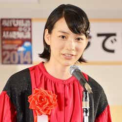 脚本家の宮藤官九郎氏とともに授賞式に出席した能年は、真っ赤なワンピースで登場。緊張した様子で「えっと…すごく私も『じぇじぇじぇ』が大好きで、聞くだけで楽しい言葉だなって思います。それをチョイスしてくる宮藤さんはさすがです。嬉しくて東北の皆さん、宮藤さんと一緒に『じぇじぇじぇ』を叫びたい気持ちです」と感想を語り、フラッシュの数に「『じぇじぇじぇ』のおかげで喜ばしいことに」と驚き。