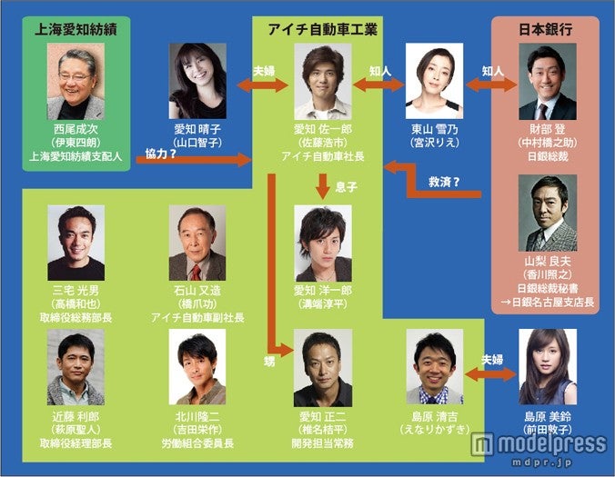 そのほか、愛知正二の友人であり、アイチ自動車の労働組合委員長・北川隆二役を吉田栄作、取締役経理部長・近藤利郎役を萩原聖人、取締役総務部長・三宅光男役を高橋和也、佐一郎を慕う若手社員・島原清吉役をえなりかずき、その妻・美鈴役を前田敦子、佐一郎の息子・愛知洋一郎役を溝端淳平、上海愛知紡績支配人・西尾成次役を伊東四朗が演じ、豪華キャストでお送りする。