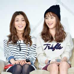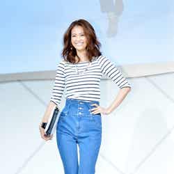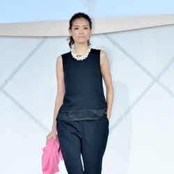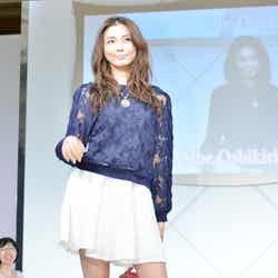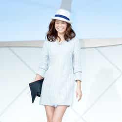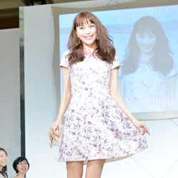 ファッションショーのトップバッターで登場した押切は、ホワイトのトップスにレースのスカートを合わせた、全身ホワイトコーデに、アクセントとしてレッドのバッグを合わせたガーリースタイルを披露。一方、蛯原は、花柄のワンピースをさらりと着こなし、夏の雰囲気を漂わせた。