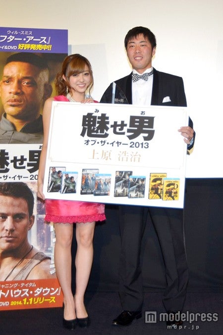 栄えある受賞者は、今年常に大事な局面で登板、ワールドシリーズでは最後の打者を三振に仕留め、日本人メジャーリーガーとして初の胴上げ投手となったボストン・レッドソックスの上原浩治投手。20日、都内で授与式が開催され、日本に帰国中の上原投手は、普段のユニフォーム姿とは異なる、タキシード姿で登壇した。タキシードは初めてと言う上原投手はワールドシリーズ制覇の感想を聞かれ「嬉しいの一言。やっと終わったと思った」としみじみ。“魅せ男”の称号には「魅せることを意識せず、やりたいことをやってきたことが結果につながった」と笑顔を見せた。