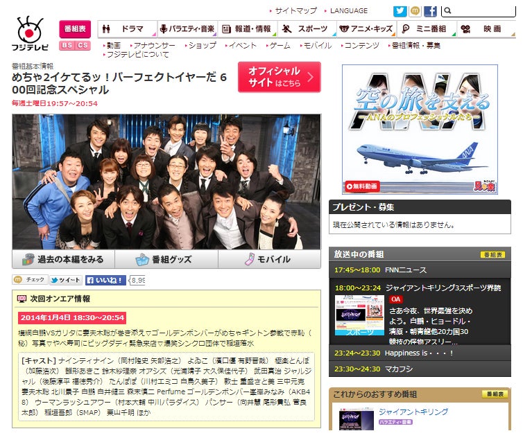 2014年1月4日に放送される「めちゃ2イケてるッ!パーフェクトイヤーだ 600回記念スペシャル」(フジテレビ系、18:30~)は豪華ゲストが集結。2時間半に拡大して放送される。