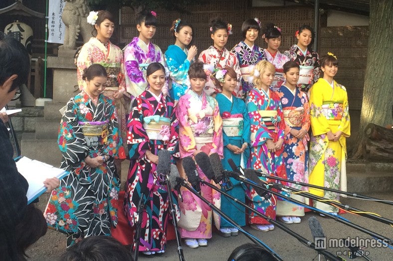 EXILE系ガールズグループ・E-girlsが東京・中目黒の八幡神社で7日、晴れ着姿で初詣を行った。