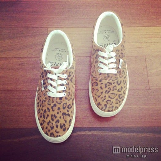豹柄の靴のように個性派デザインの靴を履きこなすなら靴下と合わせて、洋服はミニ丈トップスとのハイウェストショーパンと合わせてスタイルアップなカジュアルコーデに♪