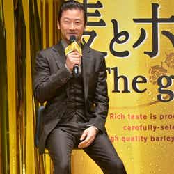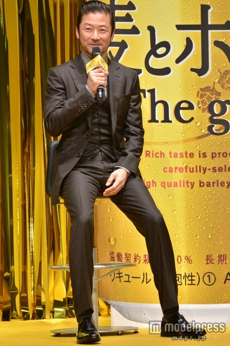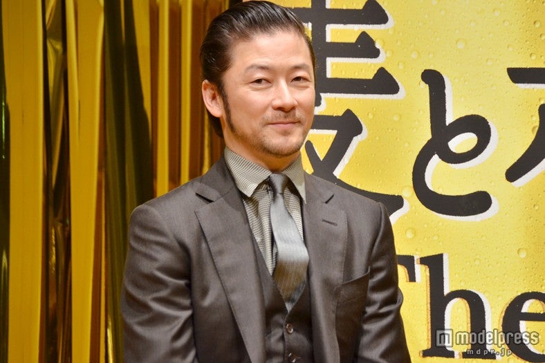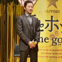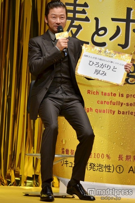 28日、都内にて行われたビールの新CMイベントに出席した、俳優の浅野忠信と岡田。岡田はシックなドットのシャツに黒のジャケットスーツを合わせ登場した。