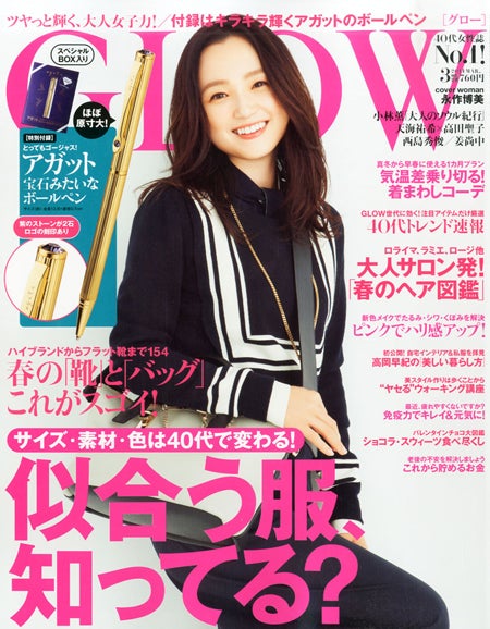 デザインの入ったニットからボウタイブラウスをチラ見せし、雑誌「GLOW」3月号の表紙を飾った永作。誌面ではヘビ柄のタイトスカートやネイビーのブーティー、フェミニンなジャンプスーツを着こなし、最旬の春のトレンドスタイルをいち早く披露した。