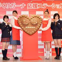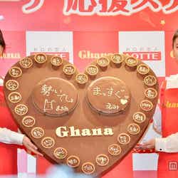 イベントを終え、フォトセッション時に、会場に設置されたハート型のオブジェに手をつけた長澤。このオブジェは本物のチョコレートで出来ており、手にチョコレートが付いてしまった。これに、長澤は困り笑い。思わぬハプニングに、武井と顔を見合わせて笑った。