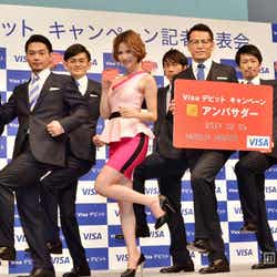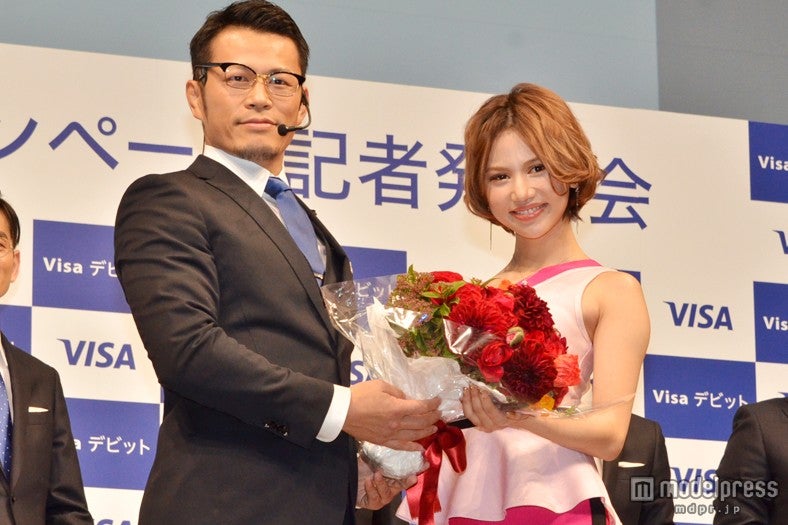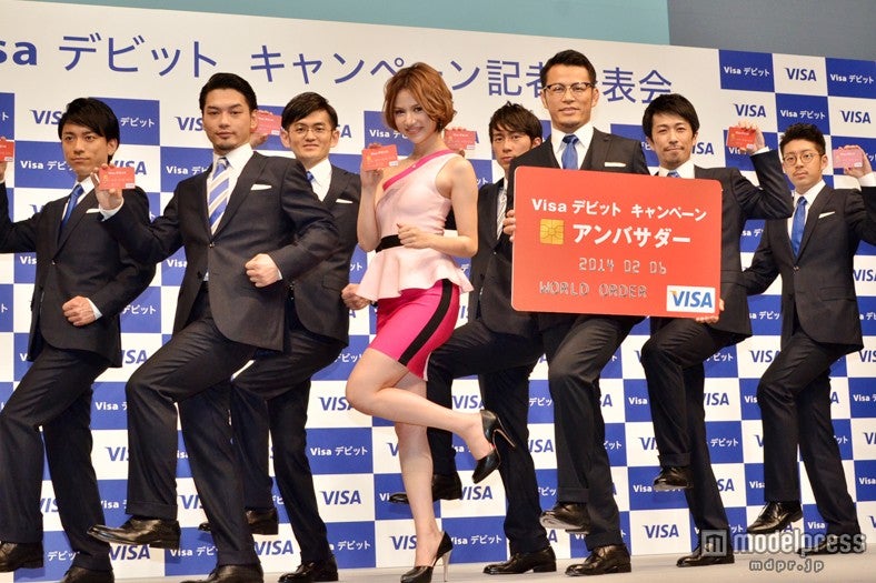 6日、都内にて行われたデビットカードのキャンペーン記者発表会に出席した水沢。色味の異なるピンクを組み合わせたワンショルダーのトップス・ミニスカートから、美しいデコルテラインと美脚を披露した。