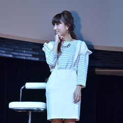 桃は26日、都内で行われたイベントのメイクショーに、水色と白のボーダーというキュートで爽やかなスタイルで登場。