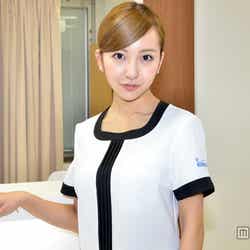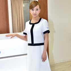 襟元、袖、ウエストをポイントに黒ラインを用いて、すっきりと見えるデザインに仕上げた制服。板野は一言で「制服っぽくない制服」とコメント。あまり悩むことなくデザインをこなしたと言い、「胸元のラインを増やしました。親しみやすくなるように、でも制服のイメージを崩さないように考えました」とこだわりを語った。この春注目しているファッションを聞かれると「今までモノトーンが多かったんですけど、春なので黄色とか色物もチェックしていますね。新たにカラーも着れたらいいなと思っています」とコメント。すでに「オレンジの花柄のワンピースを買いました。普段だったら着ないと思ったんですけど、挑戦してみようと思いました」とにっこり笑顔に。「パステルカラーと言うよりかは、はっきりとした感じのワンピースですね」と詳細を明かした。