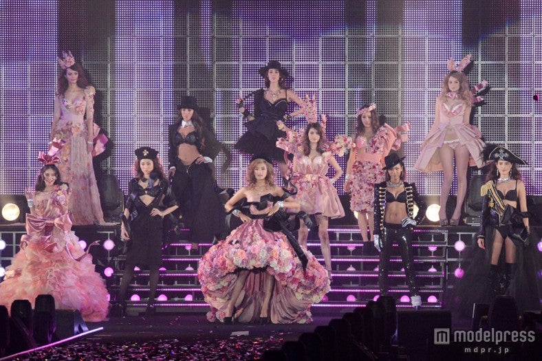 「PEACH JOHN」が贈る華やかなランジェリーショーのトリを飾ったローラは、ゴージャスなバルーンシルエットのベアトップドレスで登場。ガーリーながら落ち着いた雰囲気のシアーピンクをベースに、たっぷりと施されたフラワーモチーフ、マニッシュなハットの組み合わせが絶妙。神々しいオーラをまとったウォーキングに3万人が酔いしれた。