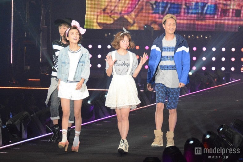 この日は宇野実彩子、伊藤千晃、與真司郎、浦田直也の4人が「good day young」ステージに登場。伊藤は今年トレンドのスウェットにサスペンダーつきのミニスカート、宇野はホワイトのセットアップにGジャンと、それぞれ個性あふれる春のコーディネートを着こなし、笑顔いっぱいのウォーキングを3万人の観客に披露した。