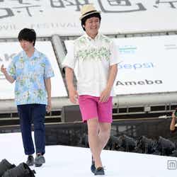 トップに現れたのは、ダレノガレ明美。いちご柄のスカートにピンクのカーディガンを合わせガーリーな雰囲気で登場すると、ファンからは歓声が上がった。続けて大橋リナ、カロリナ、玉城ティナ、ハリセンボンらが笑顔でウォーキング。今井華が「沖縄バイブス高いー!」と叫び、会場の熱気を一気に上げた。ロバート秋山が、青文字系モデルに密着?