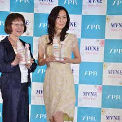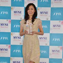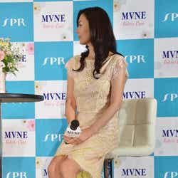 24日、都内で行われた自然派ブランド「MVNE」のCM発表会見に登壇した中山は、ベージュの総レースドレスに同系色のパンプスでスラリと伸びる美脚を披露した。