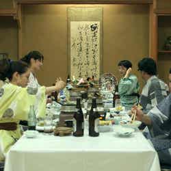 伊豆ぐらんぱる公園で大はしゃぎした後、温泉旅館へ。メンバーは浴衣姿で食事をしながら、思い出話に華を咲かせた。