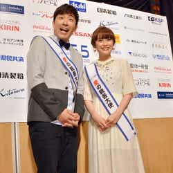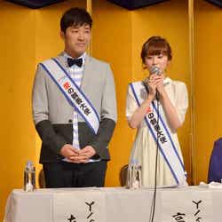 31日、横浜市内にて行われた横浜セントラルタウンフェスティバルY155開催記者発表に出席した2人。あべは水色のボーダーシャツにジャケット、高橋はビジュー付きの白のシフォンワンピース姿を披露した。