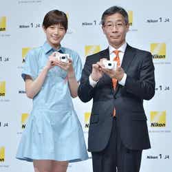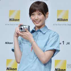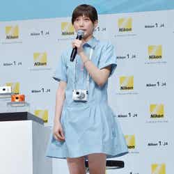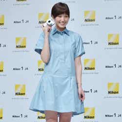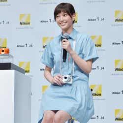 本田は10日、都内にて行われた「Nikon」新CM発表会に、爽やかな水色のミニワンピースで登場した。