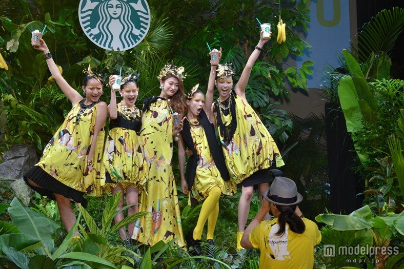 山田は15日、都内にて行われたスターバックス・コーヒーの新商品発売記念イベントに出席。胸元のイエローのスカーフがポイントのボタニカル柄のシックなミニワンピースで美脚を披露し、ゴールドにほどこされた葉の王冠を被り颯爽と登場。ランウェイをクールな表情を浮かべながら1周すると、新商品にちなんだバナナ柄の鮮やかなロングワンピースに瞬間チェンジし、会場を沸かせた。早着替えを披露した山田は、笑顔全開でロングワンピースをなびかせ、写真家のレスリー・キーのフォトセッションにモデル4人とともに参加した。