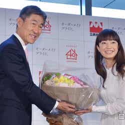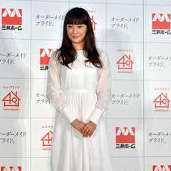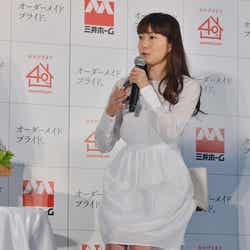 菅野は17日、都内にておこなわれた三井ホームの新CM発表会に出席。CMで着用した、透け感のある白い膝丈フレアワンピースに赤のヒールを合わせたスタイルで登場した。