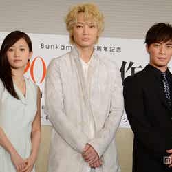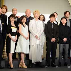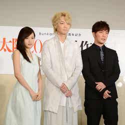 舞台「太陽2068(ニーゼロロクハチ)」は、劇団「イキウメ」を主宰する気鋭の劇作家・前川知大氏が、代表作のひとつでもある「太陽」を蜷川幸雄氏のために書きおろした作品。バイオテロにより拡散したウイルスにより、若く強い肉体を長く維持し、高い知能を得た反面、紫外線に弱く太陽光の下では活動できない「ノクス」と呼ばれる変異した人間と、普通の人間「キュリオ」が共存する社会が描かれる。キュリオとして貧困の中で育ちノクスに憧れる奥寺鉄彦役に綾野、ノクスとして生まれながらキュリオに理解を示す森繁富士太役に成宮寛貴、そして鉄彦と同じキュリオとして生きる生田結役に前田敦子が挑戦する。会見には、綾野のほか、成宮、前田、中嶋朋子、大石継太、横田栄司、内田健司、山崎一、六平直政、伊藤蘭、演出家・蜷川幸雄氏、劇作家・前川知大氏、東急文化村代表取締役社長・升田高寛氏が出席。キャスティングについて、「綾野くんとは、前から仕事をしたくて口説いていました。ようやっとスケジュールが合いました」と明かした蜷川氏。蜷川氏からのラブコールを受け主演に抜擢された綾野は、「映画でもドラマでも変わらないんですが、主役であるってことで何か気概をってことは捨てた。単純に挑戦できる幅が広がるのであれば、主役だってことをポジティブにいい意味で使えたらいいなって思っています」と意気込み、「引っ張るというよりは、おもちゃのように扱って欲しいですね」とアピールした。