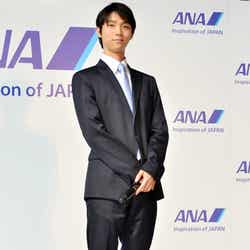24日、都内にて行われた航空会社の新制服発表会に出席した羽生選手。スーツを着こなし、飛行機から爽やかに登場した。