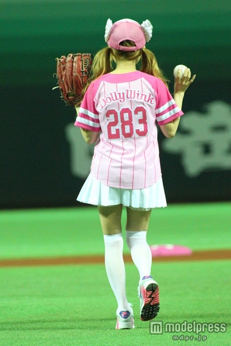 背番号“283”(つばさ)のピンク色のオリジナルユニフォームに白いミニスカート、翼つきキャップでキュートに登場した益若は、気合十分に投球するも、ボ―ルはツーバウンドでキャッチャーまで届かず。「距離が長くて全然届きませんでしたがまっすぐ飛んだのでよかったです!」と笑顔でコメント。
