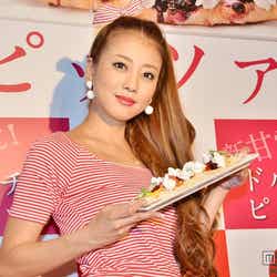 29日、都内にて行われたドルチェピッツアの発売イベントに出席した、あびる。ボーダートップスとタイトなスカートをともに赤色で合わせ、美脚を披露した。商品にちなみ「わかりやすくいちごカラーで決めてきました」と笑顔を見せた。