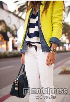 他にも、ネイビーと白のボーダーにイエローのバックや靴を合わせるだけでアクティブだけど大人見えに!!