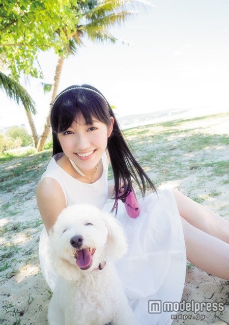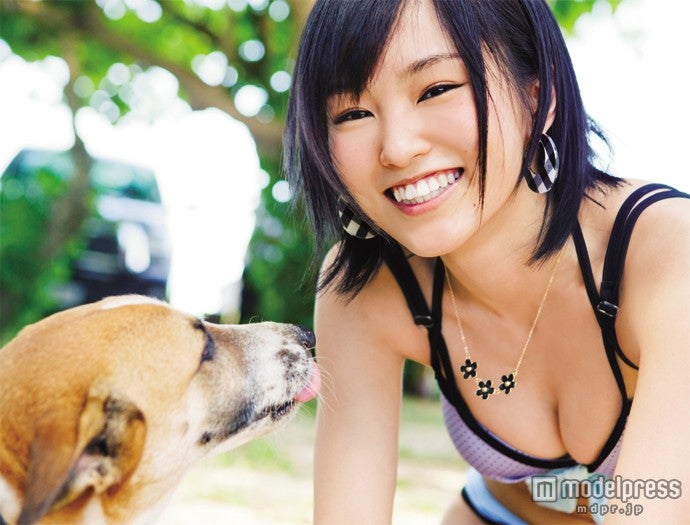 AKB48の小嶋陽菜が、キュートなビキニ姿で犬と戯れた。