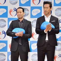 22日、都内にて行われた厚生労働省の「知って、肝炎」キックオフミーティングに出席したEXILEのHIROとNAOKI。2人はスーツ姿で登場した。