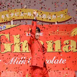 羽生選手は27日、都内で行われたチョコレート新CM発表会にて、CMに出演中の女優の土屋太鳳、松井らの掛け声に合わせ、壇上に用意された巨大なプレゼントボックスから、拳を突き上げるフィニッシュポーズでカッコよく登場。女優2人に挟まれ「照れます」と言いつつも、爽やかなスマイルを披露した。