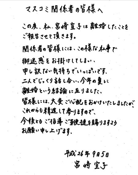 宮崎は直筆で「この度、私、宮崎宣子は離婚したことをご報告させて頂きます」と報告。「関係者の皆様には、この様な私事で御迷惑をお掛けしてしまい、申し訳ない気持ちでいっぱいです」と謝罪し、「二人でじっくり話し合い、今年の夏に離婚という結論に至りました」と明かした。
