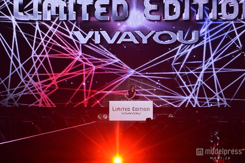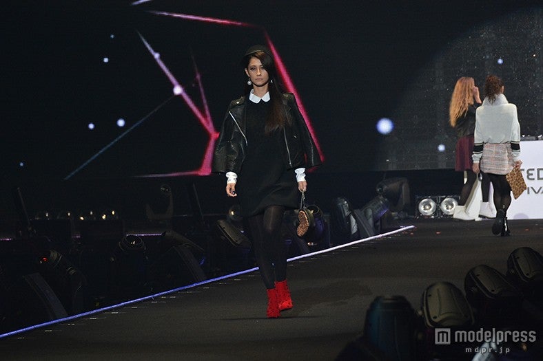 「LIMITED EDITION VIVAYOU」のステージに出演したダレノガレは、白衿レースのワンピースにライダースジャケットを羽織り、赤いスタッズのショートブーツをアクセントにした着こなし。クールビューティな眼差しでランウェイを歩くと会場から大きな歓声が沸いた。