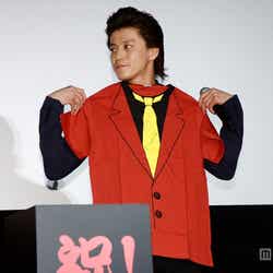 この日は、観客に“お宝をお裾分け”する企画を展開。実際にルパン三世演じる小栗が劇中で着用していた赤ジャケットを観客1名に抽選でプレゼントすることになった。小栗は「これはアクション用ではないのですが、このジャケットは(着ると)暑い。しかもタイ(撮影現場)もすごく暑いんですよ。だから洗濯しても取れないぐらい、おれの汗が付いているかも」と話すと、当たったファンは興奮していた。