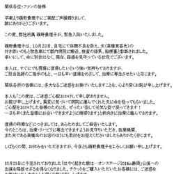 磯野は「この度は、ご迷惑ご心配おかけして申し訳ありません。お詫び申し上げます。異変に気づいて病院に運んでくれた夫に命を拾ってもらいました。ご心配をおかけした皆様のためにも、ぜったい治して元気な姿で戻ってきます!一日も早くまた皆様にお会いできますように頑張ります」とコメント。復帰の時期は改めて報告するとしている。