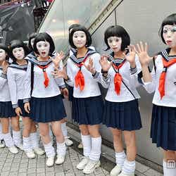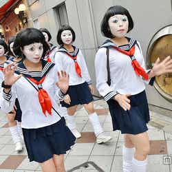 突如現れたセーラー服の朱美ちゃん集団に、人々は騒然。「かわいいー」「すごいー」といった声が飛び交い、写真撮影をする人の姿も。通行人に手を振ったり、「ダメよ~ダメダメ!」とものまねをしたりとイベントを盛り上げた。