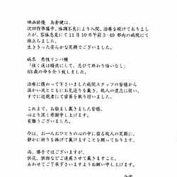 治療に携わって下さいました病院スタッフの皆様から温かい涙とともにお見送りを戴き、故人の遺志に従い、すでに近親者にて密葬を執り行いました。