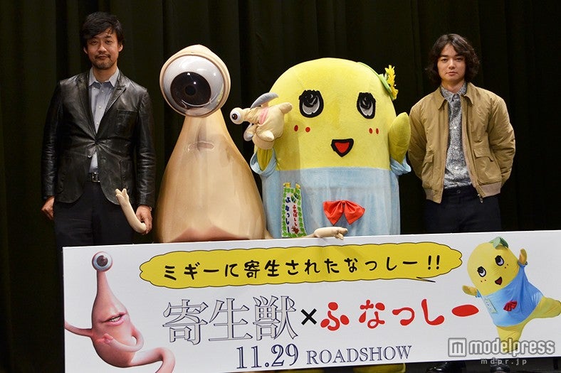 また、主演を務めた染谷に対して「染谷さんがミギーに寄生されて、徐々に感化されていくところがすごかったなっしー」と伝えると、染谷は「ふつーに褒めてくれましたね」と照れ笑い。さらに「内面からちゃんと変わっていく感じがすごい表れてたなっしー」と語ると、ふと謙虚に「どこから目線でいってるんだなって話だなー」と自虐的に語り会場の笑いを誘った。さらにミギーを見つめ「ドギツイ感じがしたけど見慣れてくるとかわいいなっしー。つるつるの質感がかわいいなっしーな~」と身体を寄せ合う場面も。最後には「寄生汁ブシャー!」との掛け声で、染谷や監督とジャンプを披露し大盛況の中でイベントを終えた。同作は、1990年より「月刊アフタヌーン」(講談社)に連載されていたSF漫画であり、累計発行部数1100万部を突破する人気作。普通の男子高校生からパラサイト「ミギー」に寄生され、過酷な運命に身を投じる主人公・泉新一を染谷が演じる。そのほか深津絵里、東出昌大、橋本愛らも出演し、「寄生獣 完結編」(2015年4月25日公開)との2部作となっている。(modelpress編集部)