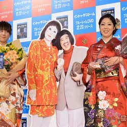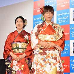 11日、都内にて行われた『イントゥ・ザ・ストーム』DVD&Blu-ray発売記念PRイベントに出席した日本エレキテル連合。この日はお馴染みの“未亡人朱美ちゃん3号と細貝さん”メイクを封印した素顔を披露し、“紅白”のしっとり和装姿で登場した。