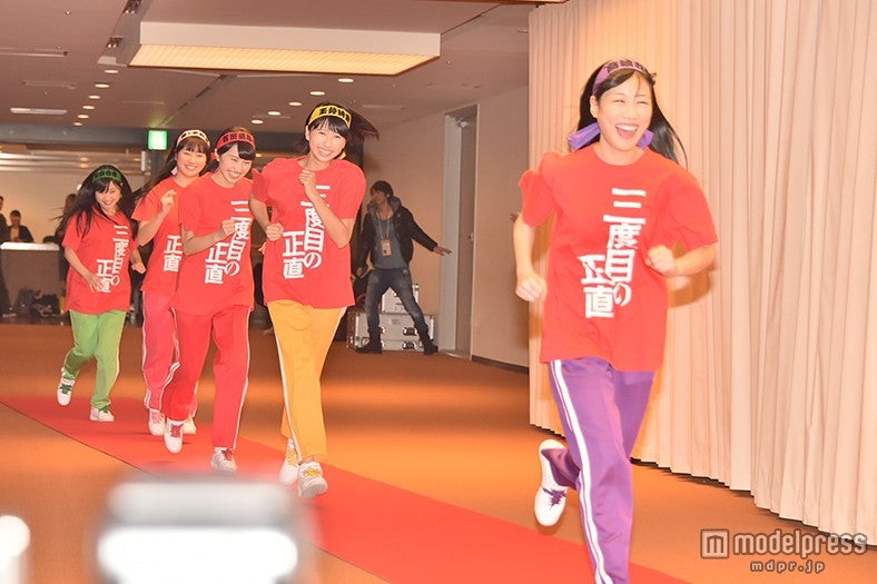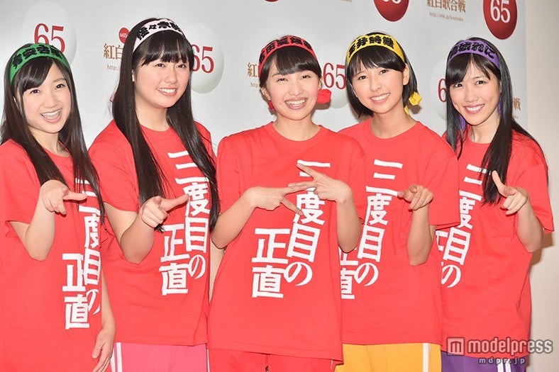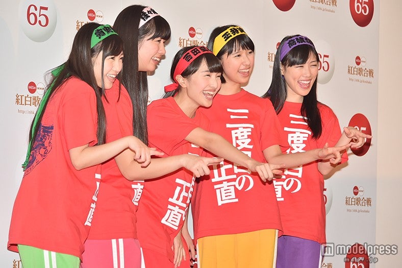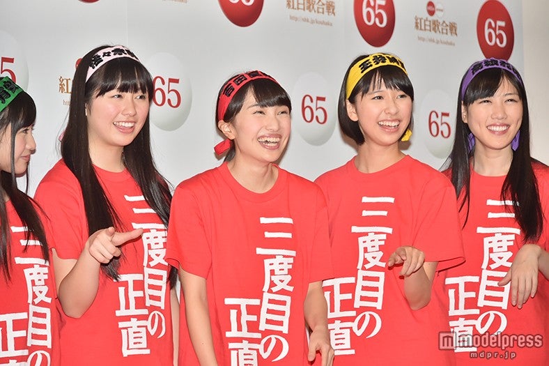 3年連続3度目の紅白出場となるももクロは、「三度目の正直」と書かれたお揃いのTシャツを着て登場し、その意味については「モノノフ(=ももクロファンの総称)のみんなと一緒に紅白に出たいねって夢があったんですが、3度目にして夢が叶うので」(百田夏菜子)と説明。言葉の通り、紅白本番では先日行われたクリスマスライブにて収録したというファンの合唱とともに「一緒に歌う」予定で、衣装も「真っ白い服にファンの方がメンバーカラーでメッセージを書き込んでくれた」ものを着用。合唱には9万人、メッセージには1万人が参加したそうで「壮大なものになっています」(高城れに)と自信を覗かせた。