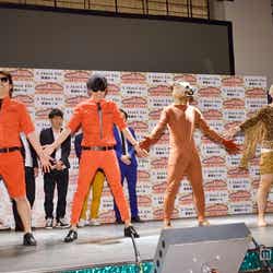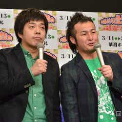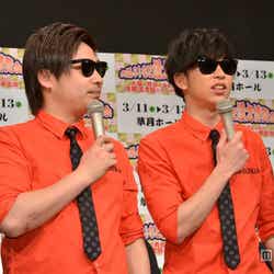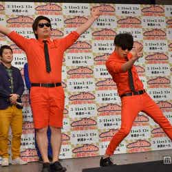 12日、都内にて行われた「大阪よしもと漫才博覧会」の開催発表会見に応援ゲストとして登場した千鳥。大阪の凄腕漫才師400組から厳選された250組500名以上が東京に集う同イベントだが、人気沸騰中の8.6秒バズーカーに寄せたサングラスを装着し、リズムネタ「ラッスンゴレライ」を披露した。
