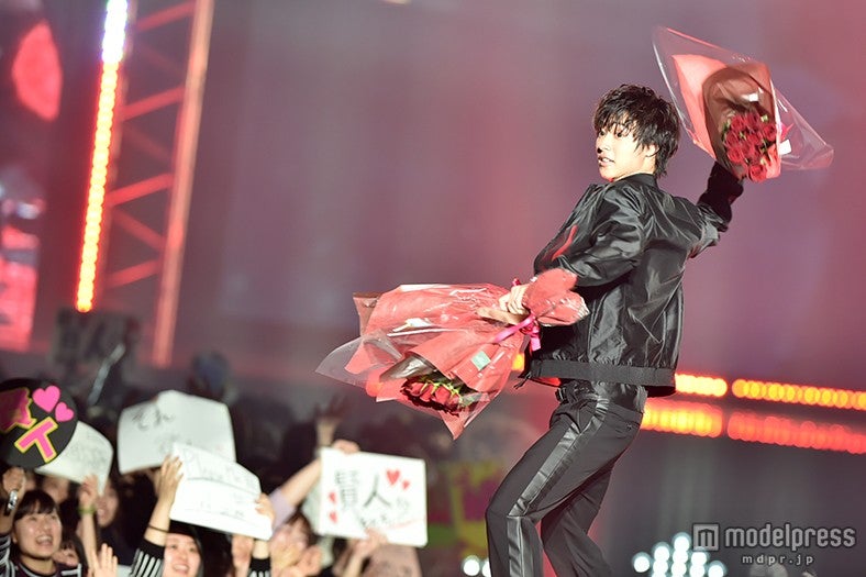 昨年、映画「L・DK」で披露した“壁ドン”で流行語大賞にノミネートされ“壁ドン王子”として一躍話題に。今年は3月スタートのNHK連続テレビ小説「まれ」への出演を控えさらなるブレイクが期待される。山崎の登場を知らせる紹介VTRが流れると、今か今かと待ちわびた観客から悲鳴にも近い歓声がこだま。爽やかな笑顔の山崎から客席へバラの花束が投げ込まれると、その歓声はさらに大きくなった。