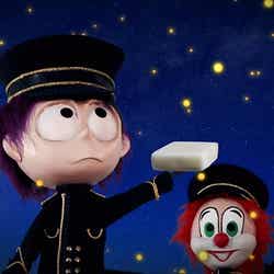 CMの舞台が「夜空を走る列車の中」という設定上、スタジオ内は一面がCG合成用のブルーバックで行われたが、Fukaseがグミに見立てた星くずを地上にまくシーンでは、あたかも下に街が存在しているかのような演技を見せ、監督からも「いいですね!さすがです(笑)」の一声が。スタッフからも感嘆の声があがり、その後も順調に撮影が進んでいった。撮影の合間には、Fukaseが楽器の演奏を真似する場面や、最近あった面白い話を披露するDJ LOVEに笑わされたFukaseを見て、NakajinとSaoriもつられて笑ってしまうという微笑ましい場面も。地上にいるパペットの自分たちを見下ろすシーンでは、自分たちと同じ姿をしたパペットを見てそれぞれ驚き、お互いのパペットの感想を言い合うなど、終始和やかな雰囲気に包まれていた。(modelpress編集部)