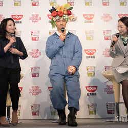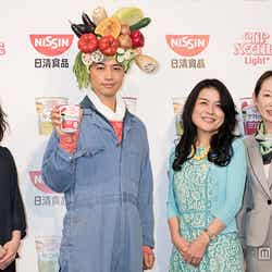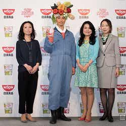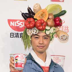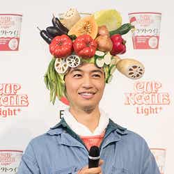 18日、都内で行われた日清食品のテレビCM発表会に登場。“ベジヘッド(野菜満載のかぶり物)”を頭に被った農夫姿で、野菜の積まれたリヤカーを押しながら入場し、「野菜うまいだろ?いい食べっぷりだ」と新CMでのセリフを来場者に向け披露した。