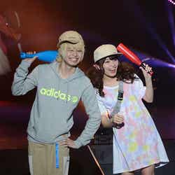 松本はパステルブルーのスウェットにイエローのチュールスカートを合わせた春スタイルを、れいぽんはイエローのトップスに白のストライプパンツ、ロングジャケットを羽織ったボーイッシュコーデを披露。春を先取りしたスタイルでステージを華やかに彩った。