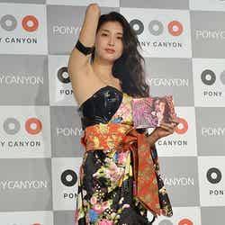 11日、都内にて主演ドラマ「女王様のおもてなし」のDVD発売記念イベントを開催。イベント前の囲み取材では劇中の和風ボンテージ衣装に鞭を持って登場し、豊満美バストを披露した。