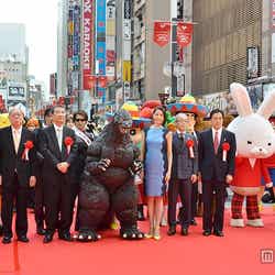 また、式典にはゴジラやクレヨンしんちゃんファミリー、紙兎ロペなど、映画に縁のあるキャラクター達も多数登場。16歳の時に「ゴジラ×モスラ×メカゴジラ 東京SOS」(2003)にモスラを呼ぶ妖精役で出演し、ゴジラと共演している長澤は「お久しぶりって感じですね(笑)」とにっこり。