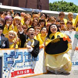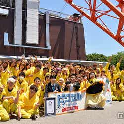 21日、都内で開催された映画『ピクセル』の特別企画「パックマン35周年記念、ギネス世界記録に挑戦」イベントに出席。黄色いカッパの上下を着込んだ351人の参加者がパックマンのイメージのまま5分間静止し、目視やドローンで上空から撮影した映像にて、最大人数でのイメージ作りに成功したとして、ギネス世界記録に認定された。