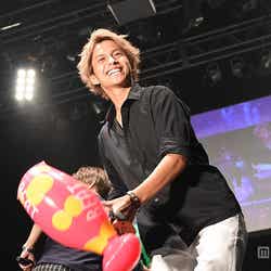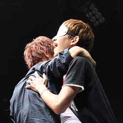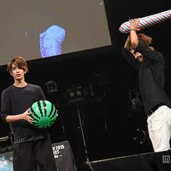 2組目はバトシン&中島健。目隠しでスイカを探す中島の後ろからいたずらっぽい表情でバトシンが近づき、中島を思い切りヒット。「何してるんだよ!」と怒りモードの中島にバトシンも応戦。2人はもみ合いながらランウェイ先端まで進んだところで、仲直りのキスを披露。会場からは悲鳴のような歓声が起こり、女子たちを大興奮させた。