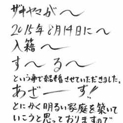 山崎は直筆の書面で「ザキヤマが~ 2015年8月14日に~ 入籍~ す~る~ という事で結婚させていただきました。あざーす!!」と喜びいっぱいに報告。「とにかく明るい家庭を築いていこうと思っておりますので今後ともよろしくお願いいたします」とコメントした。