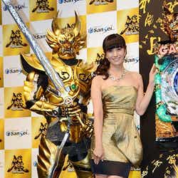 19日、テレビドラマ「牙狼<GARO>-魔戒ノ花-」を原作としたパチンコ台のプレス発表会に出席。騎士と魔獣との戦いを独特の世界観、迫力あるアクションシーン、壮大なVFXで描いたドラマで、秋元は女魔戒法師・媚空を熱演した。ざわちんが披露したのは、その媚空を演じる秋元のものまねメイク。媚空をイメージした衣装をまとったざわちんは「女魔戒法師・媚空です」と凛々しく登場した。